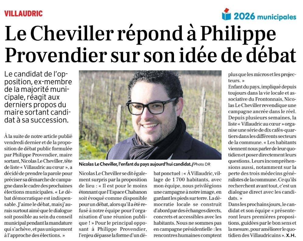 L’actualité des élections municipales de Villaudric s’accélère. Dans une récente parution de La Dépêche du Midi, Nicolas Le Cheviller a apporté une réponse claire à la proposition de débat public formulée par Philippe Provendier.